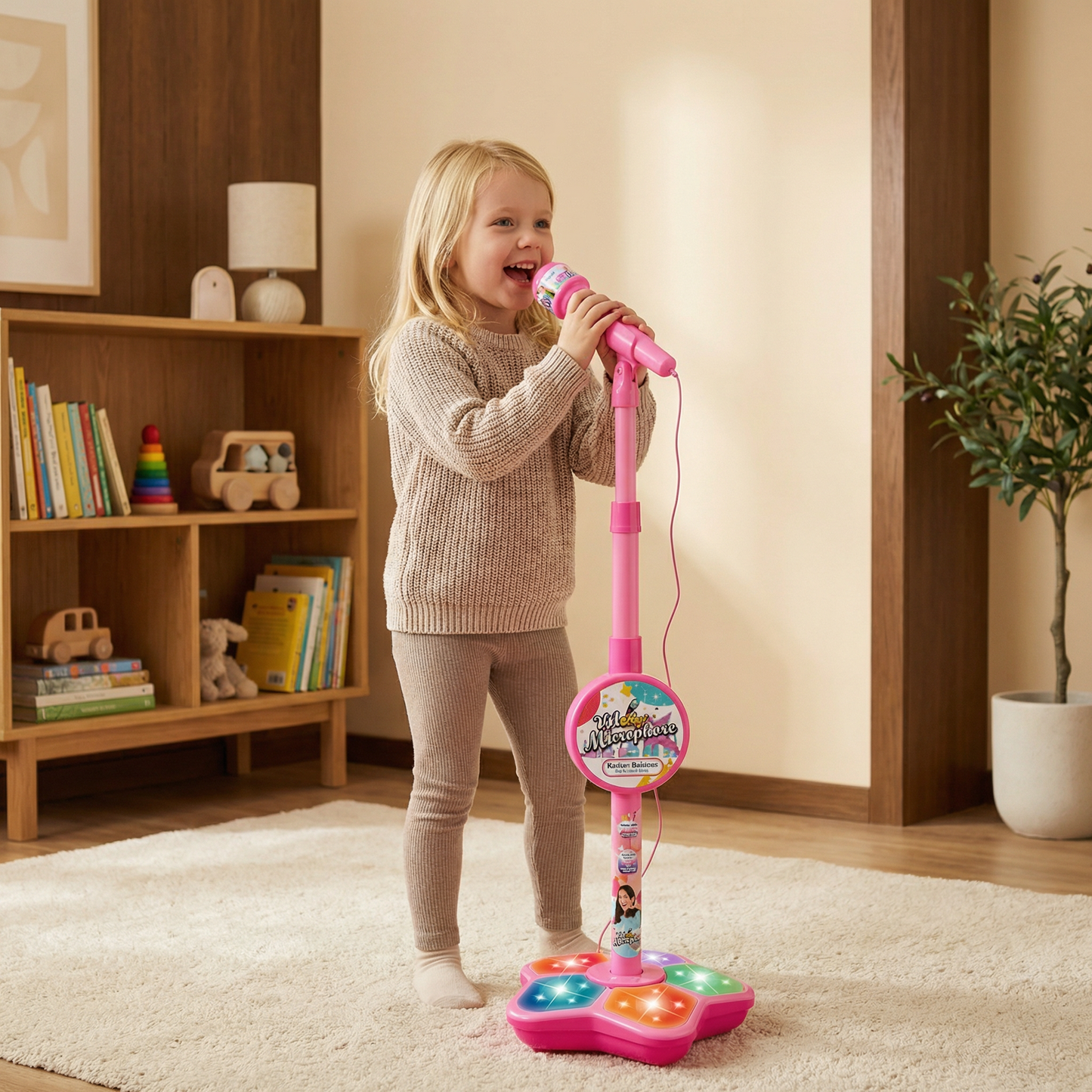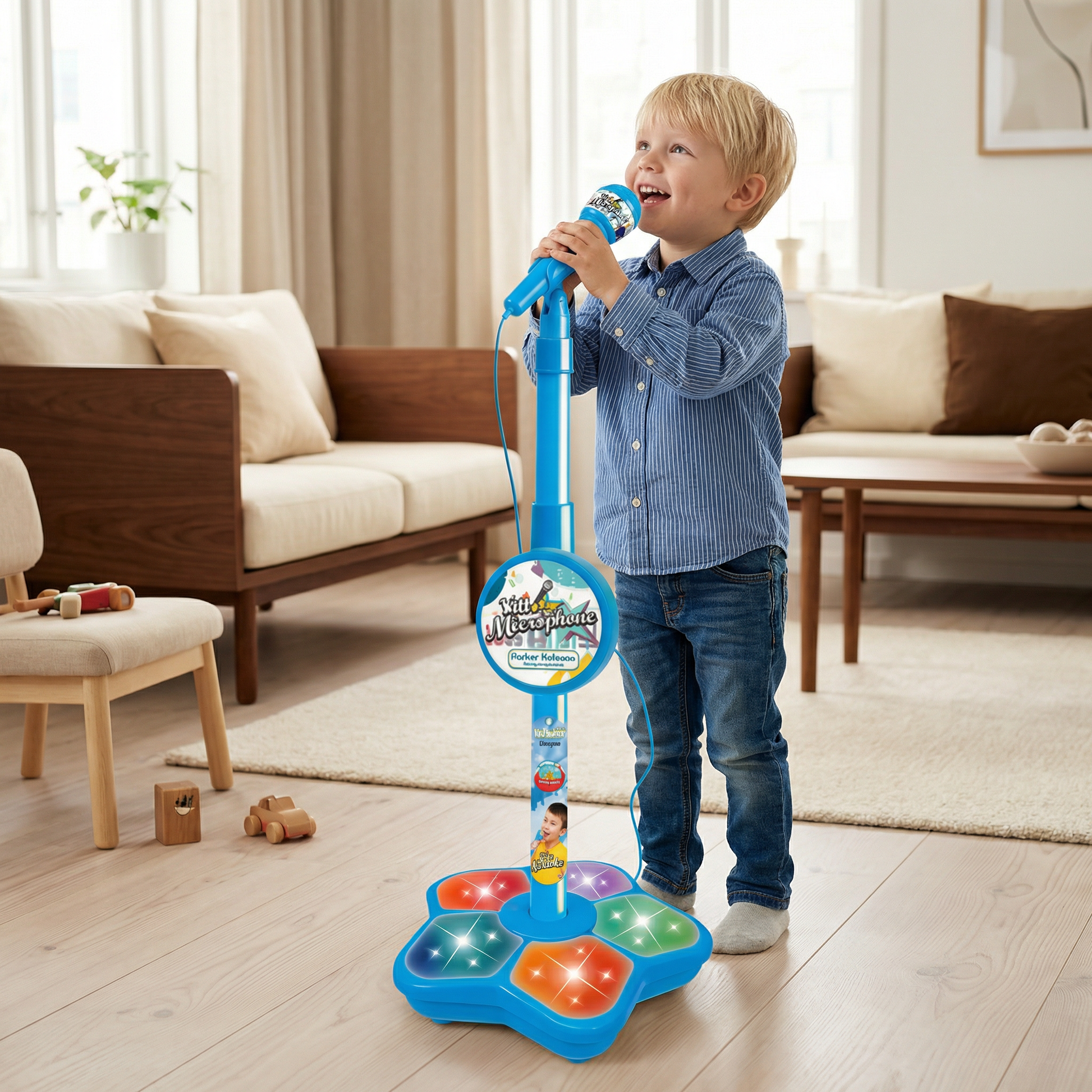 Låt barnets röst ta plats på scenen! Denna mikrofon med stativ för barn förvandlar vardagsrummet eller barnrummet till en rolig liten scen där fantasi, musik och kreativitet får blomma. Perfekt för barn som älskar att sjunga, uppträda eller bara leka artist.